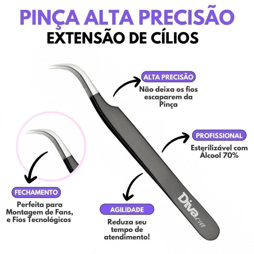 - 1 pinça ponta curva para volume russo, mega volume e fio a fio